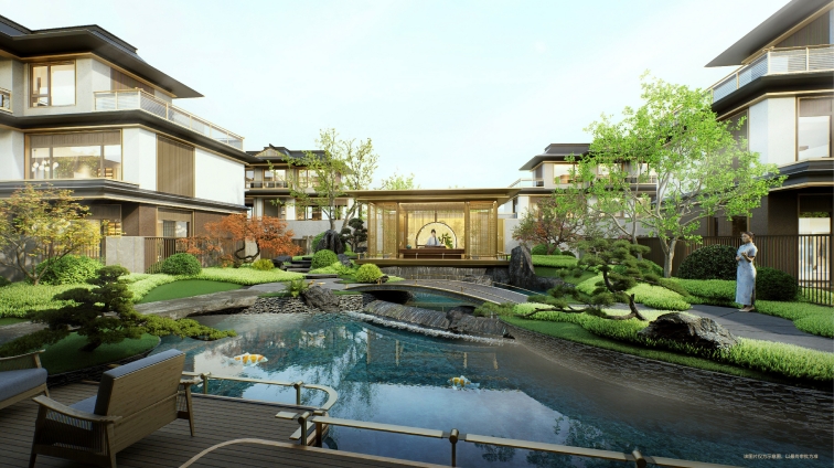 在建筑園林打造上,延續“山河”系列一脈相承的宋式美學(xué)基因,萃取《營(yíng)造法式》中經(jīng)典建筑語(yǔ)匯,以“落客、登門(mén)、入境、入畫(huà)、人心”五進(jìn)禮序空間,層層遞進(jìn),演繹歸家儀式感。同時(shí)遵循宋代園林“堆山、疊石、理水”的造園古法,將建筑輪廓、錯落灌木、蜿蜒小橋與靈動(dòng)流水相融,構建高、中、低三重立體景深層次。日常動(dòng)線(xiàn)仿若穿行于流動(dòng)的宋風(fēng)長(cháng)卷,意境悠遠,心歸畫(huà)中。